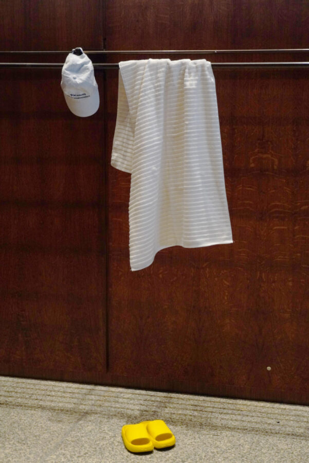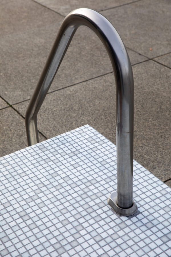The left-hand Mies cloakroom in the hall is transformed into a time machine that speaks of our possible futures by delving into recent pasts. It becomes a changing room, while two pool ladders attached to the rear balustrade of the terrace frame the dimensions of a public swimming pool. These elements originate from the SEZ (Sports and Recreation Center), an architectural milestone of East Berlin now undergoing a process of demolition.