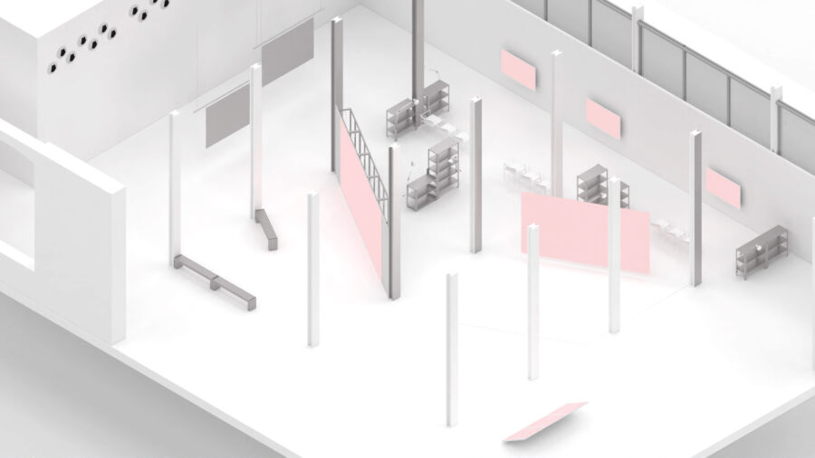 Currently, the catalogue of exhibition elements for La Fabra is composed of a walling system, a foldable screen, and a set of furniture.