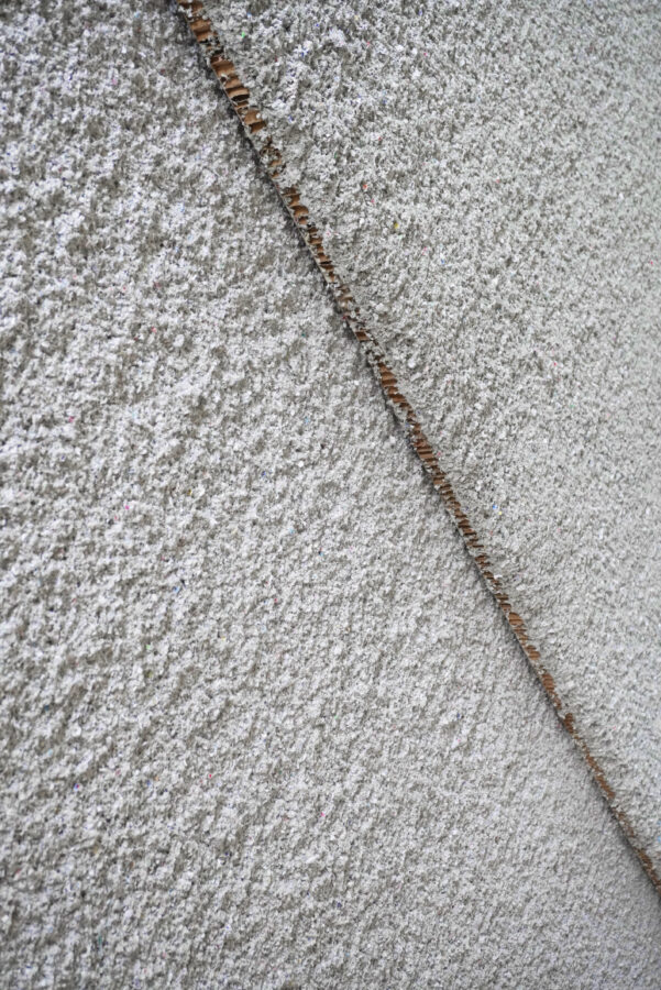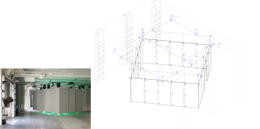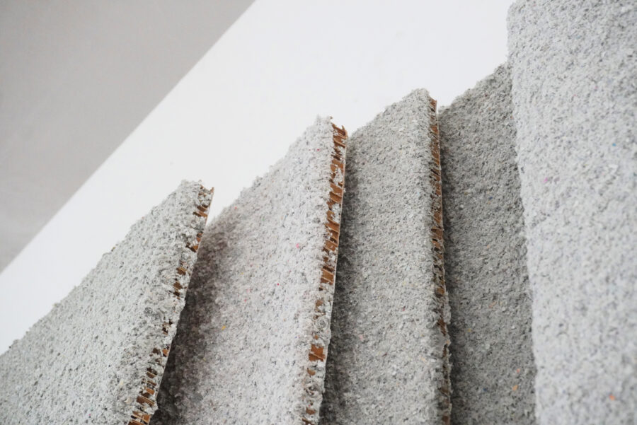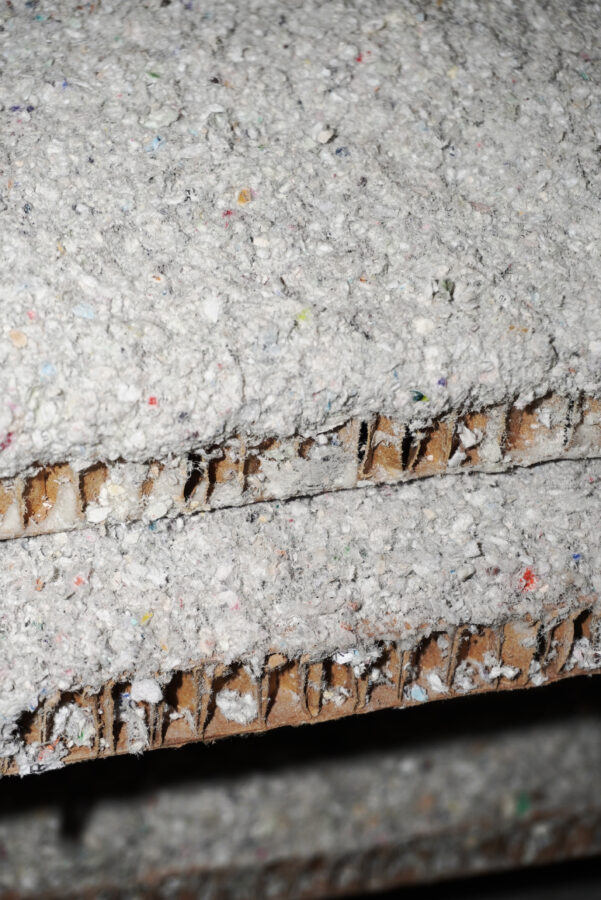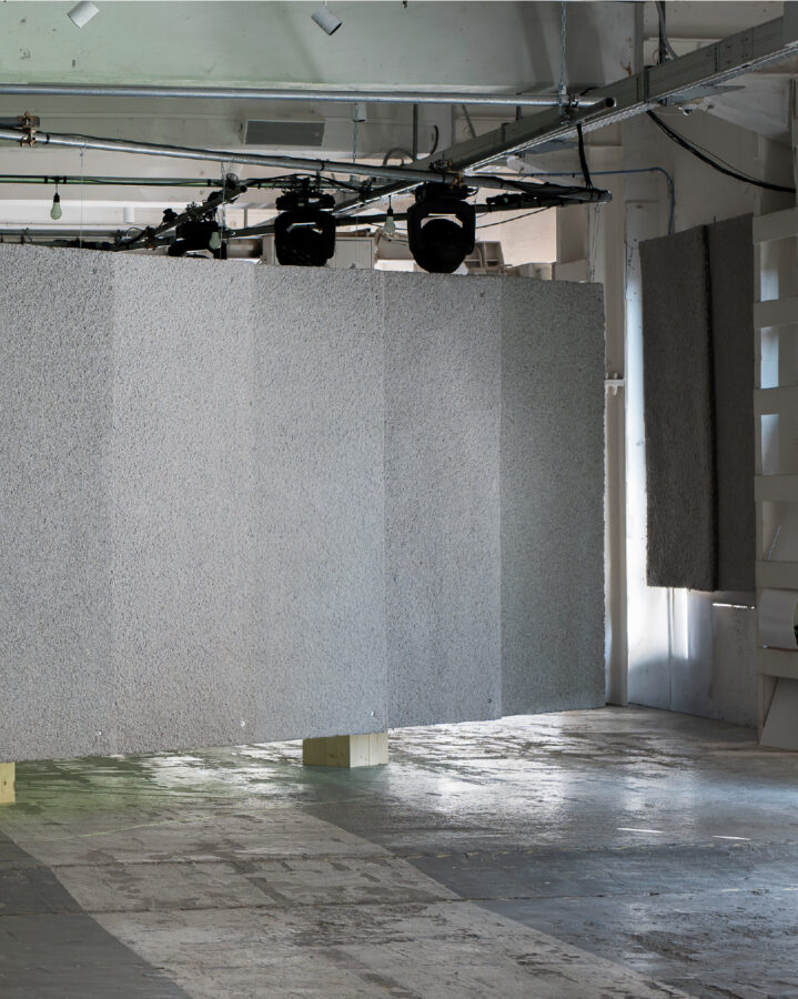 Departing from an ethos of care for the life and afterlife of the materials we use, we developed a modular architectural system made entirely from reused components and recycled cellulose. Conceived as a low-impact, temporary infrastructure, the installation minimizes waste while ensuring post-exhibition reuse and/or recyclability.